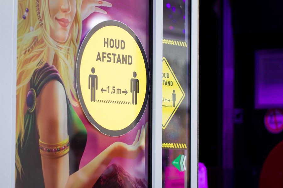 Photo taken on Nov. 1, 2021 shows a COVID-19 precaution notice asking people to keep 1.5-meter social distance at a shop in Amsterdam, the Netherlands. (Photo by Sylvia Lederer/Xinhua)