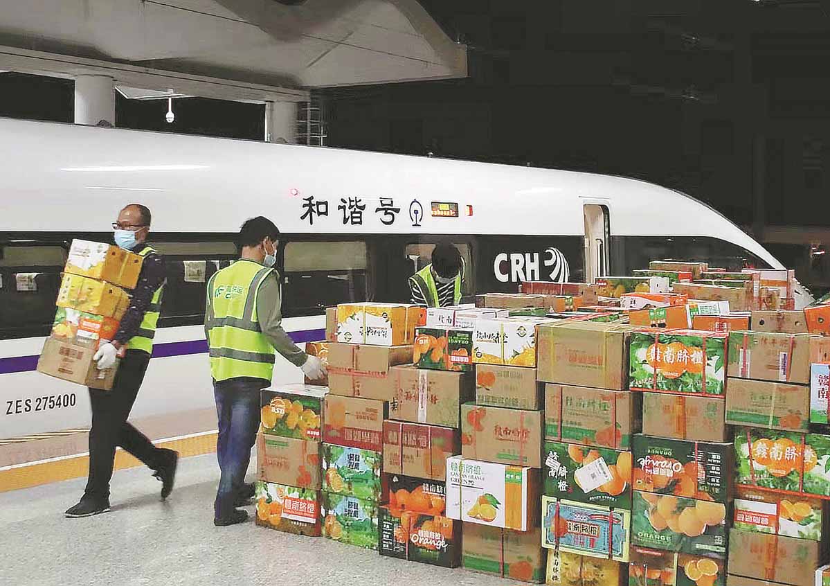 Delivery workers move orders of navel oranges onto a high-speed train in Ganzhou, Jiangxi province, on Thursday. NI SHUXUN/FOR CHINA DAILY