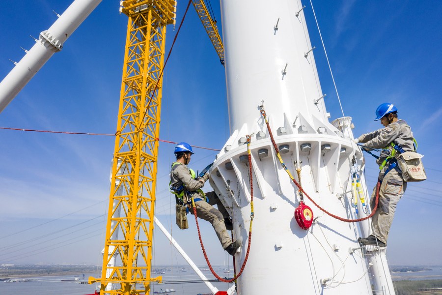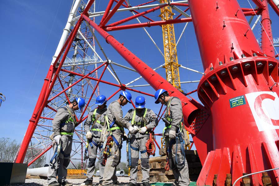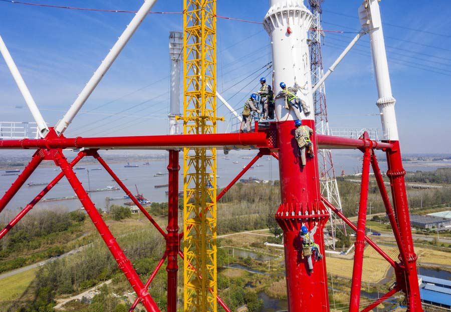 The power transmission construction workers prepare to climb up the electric tower at a construction site in Wuhu City, east China's Anhui Province, Nov. 11, 2021. (Xinhua/Du Yu)