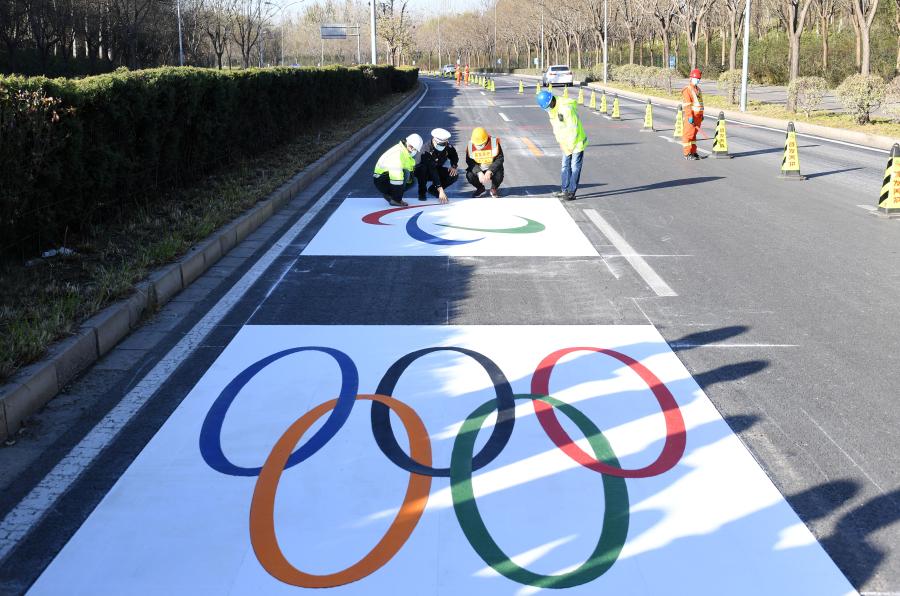 Road workers paint markings featuring Olympic and Paralympic logos on the road at the west side of the Olympic Park in Beijing on Nov. 12, 2021. (Xinhua via Beijing Municipal Commission of Transport)