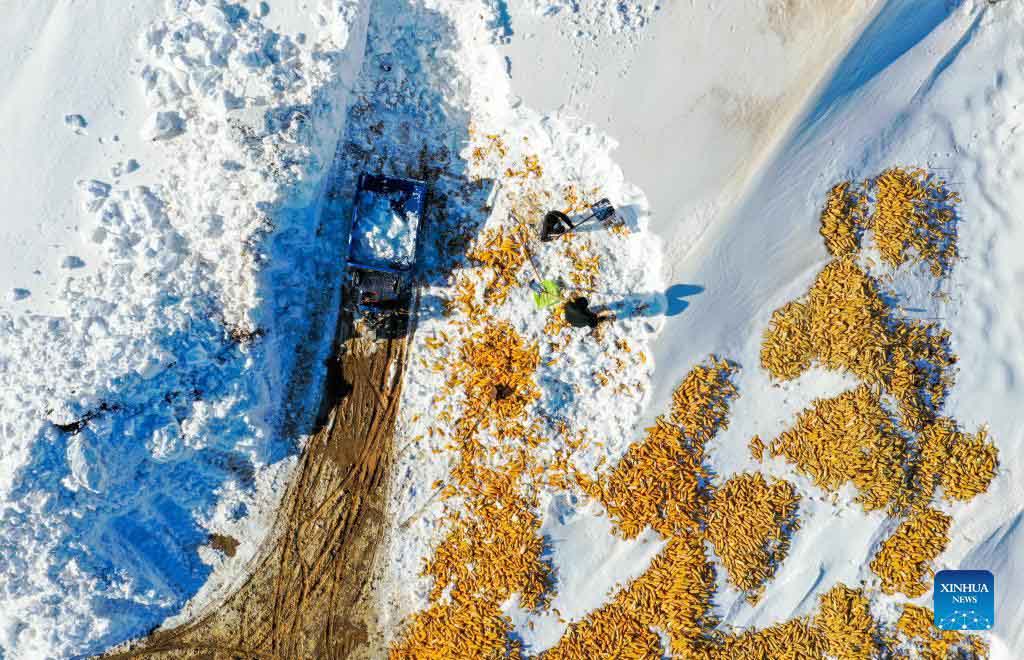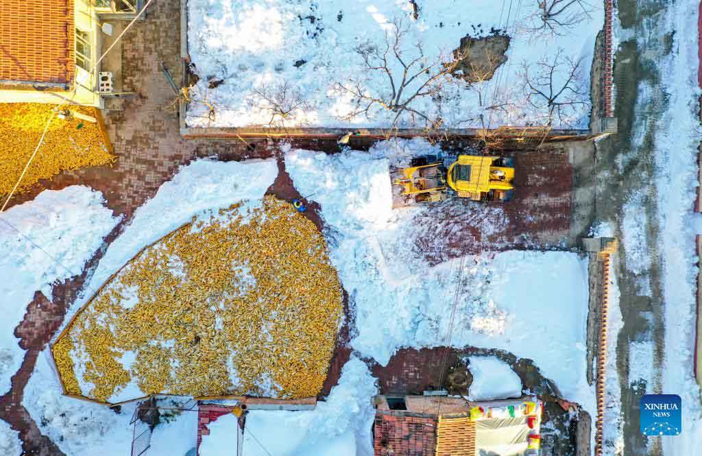 Aerial photo shows villagers clearing snow in Kulun Banner of Tongliao, north China's Inner Mongolia Autonomous Region, Nov. 12, 2021. Tongliao City in north China's Inner Mongolia has been walloped by the strongest snowstorm ever recorded. Faced with the recent cold weather and snowstorms, the local authorities have launched an emergency program to ensure transportation safety, power supply as well as agricultural and husbandry production, guaranteeing people's normal life. (Xinhua/Lian Zhen)