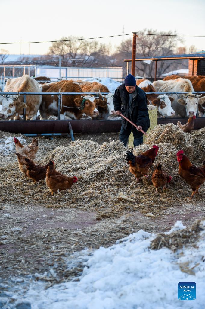 A villager feeds his cows in Kulun Banner of Tongliao, north China's Inner Mongolia Autonomous Region, Nov. 12, 2021. Tongliao City in north China's Inner Mongolia has been walloped by the strongest snowstorm ever recorded. Faced with the recent cold weather and snowstorms, the local authorities have launched an emergency program to ensure transportation safety, power supply as well as agricultural and husbandry production, guaranteeing people's normal life. (Xinhua/Lian Zhen)