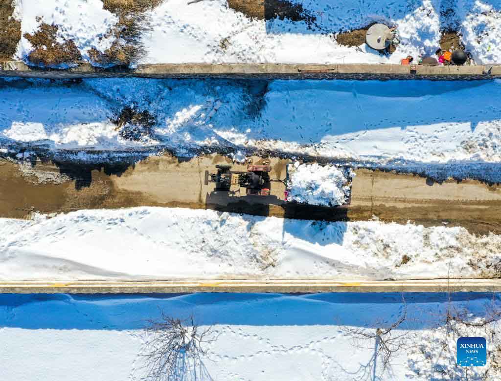 Aerial photo shows villagers clearing snow in Kulun Banner of Tongliao, north China's Inner Mongolia Autonomous Region, Nov. 13, 2021. Tongliao City in north China's Inner Mongolia has been walloped by the strongest snowstorm ever recorded. Faced with the recent cold weather and snowstorms, the local authorities have launched an emergency program to ensure transportation safety, power supply as well as agricultural and husbandry production, guaranteeing people's normal life. (Xinhua/Lian Zhen)