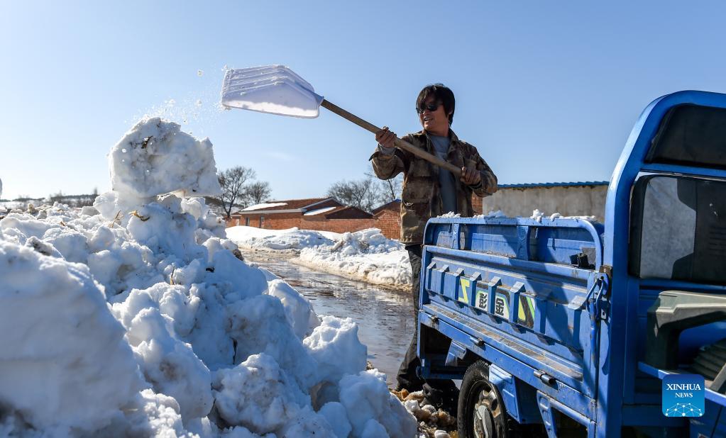 A villager clears snow in Kulun Banner of Tongliao, north China's Inner Mongolia Autonomous Region, Nov. 13, 2021. Tongliao City in north China's Inner Mongolia has been walloped by the strongest snowstorm ever recorded. Faced with the recent cold weather and snowstorms, the local authorities have launched an emergency program to ensure transportation safety, power supply as well as agricultural and husbandry production, guaranteeing people's normal life. (Xinhua/Lian Zhen)