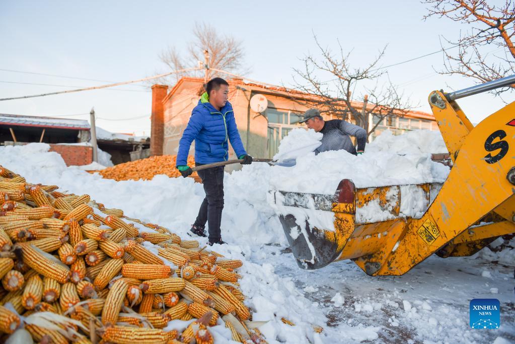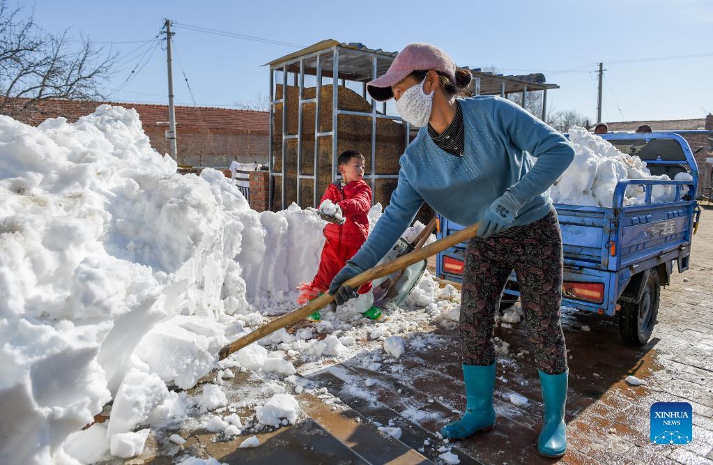 Villagers clear snow in Kulun Banner of Tongliao, north China's Inner Mongolia Autonomous Region, Nov. 13, 2021. Tongliao City in north China's Inner Mongolia has been walloped by the strongest snowstorm ever recorded. Faced with the recent cold weather and snowstorms, the local authorities have launched an emergency program to ensure transportation safety, power supply as well as agricultural and husbandry production, guaranteeing people's normal life. (Xinhua/Lian Zhen)