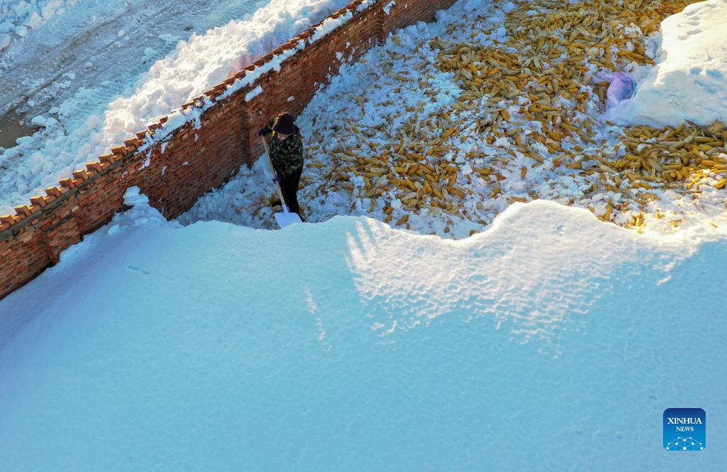 Aerial photo shows a villager clearing snow in Kulun Banner of Tongliao, north China's Inner Mongolia Autonomous Region, Nov. 12, 2021. Tongliao City in north China's Inner Mongolia has been walloped by the strongest snowstorm ever recorded. Faced with the recent cold weather and snowstorms, the local authorities have launched an emergency program to ensure transportation safety, power supply as well as agricultural and husbandry production, guaranteeing people's normal life. (Xinhua/Lian Zhen)