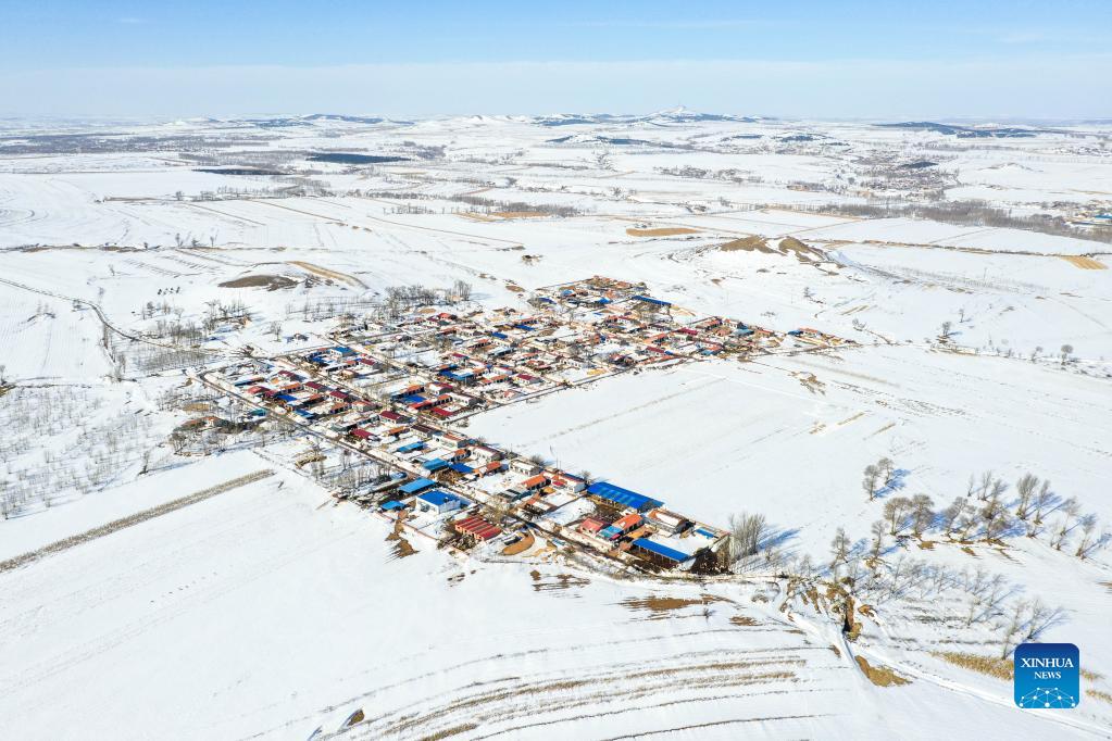 Aerial photo shows a snow-coverd village in Kulun Banner of Tongliao, north China's Inner Mongolia Autonomous Region, Nov. 13, 2021. Tongliao City in north China's Inner Mongolia has been walloped by the strongest snowstorm ever recorded. Faced with the recent cold weather and snowstorms, the local authorities have launched an emergency program to ensure transportation safety, power supply as well as agricultural and husbandry production, guaranteeing people's normal life. (Xinhua/Lian Zhen)