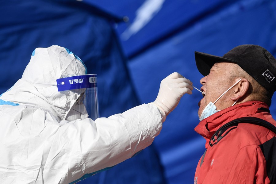 A medical worker takes a swab sample from a citizen for nucleic acid test at a testing site in Chengxi District of Xining, northwest China's Qinghai Province, Nov. 8, 2021. (Xinhua/Zhang Long)