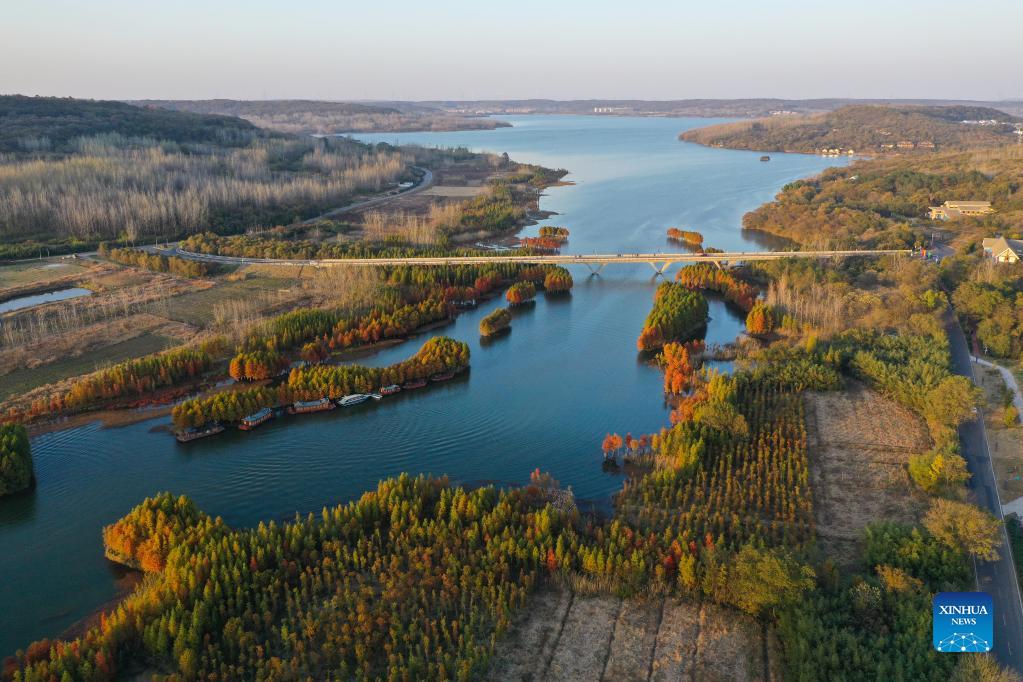 Aerial photo taken on Nov. 13, 2021 shows a winter landscape of Tianquan Lake in Xuyi County, east China's Jiangsu Province. (Xinhua/Ji Chunpeng)