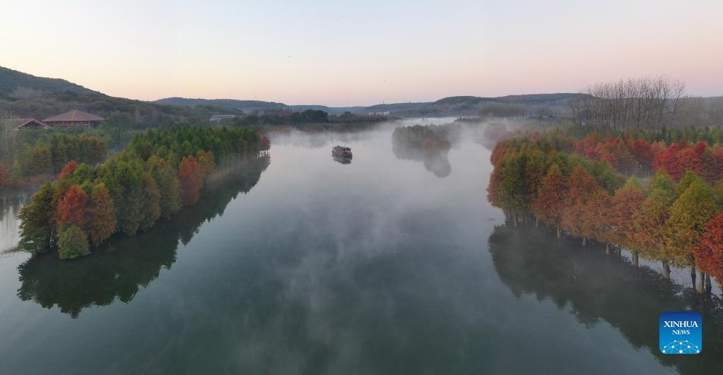 Aerial photo taken on Nov. 14, 2021 shows a winter landscape of Tianquan Lake in Xuyi County, east China's Jiangsu Province. (Xinhua/Ji Chunpeng)