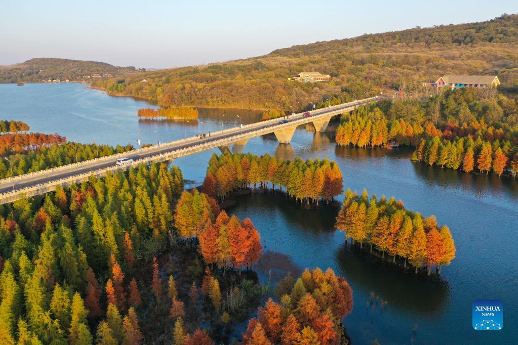 Aerial photo taken on Nov. 13, 2021 shows a winter landscape of Tianquan Lake in Xuyi County, east China's Jiangsu Province. (Xinhua/Ji Chunpeng)