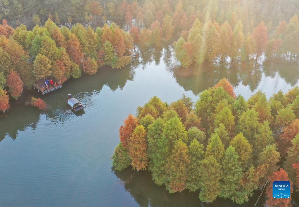 Aerial photo taken on Nov. 14, 2021 shows a winter landscape of Tianquan Lake in Xuyi County, east China's Jiangsu Province. (Xinhua/Ji Chunpeng)
