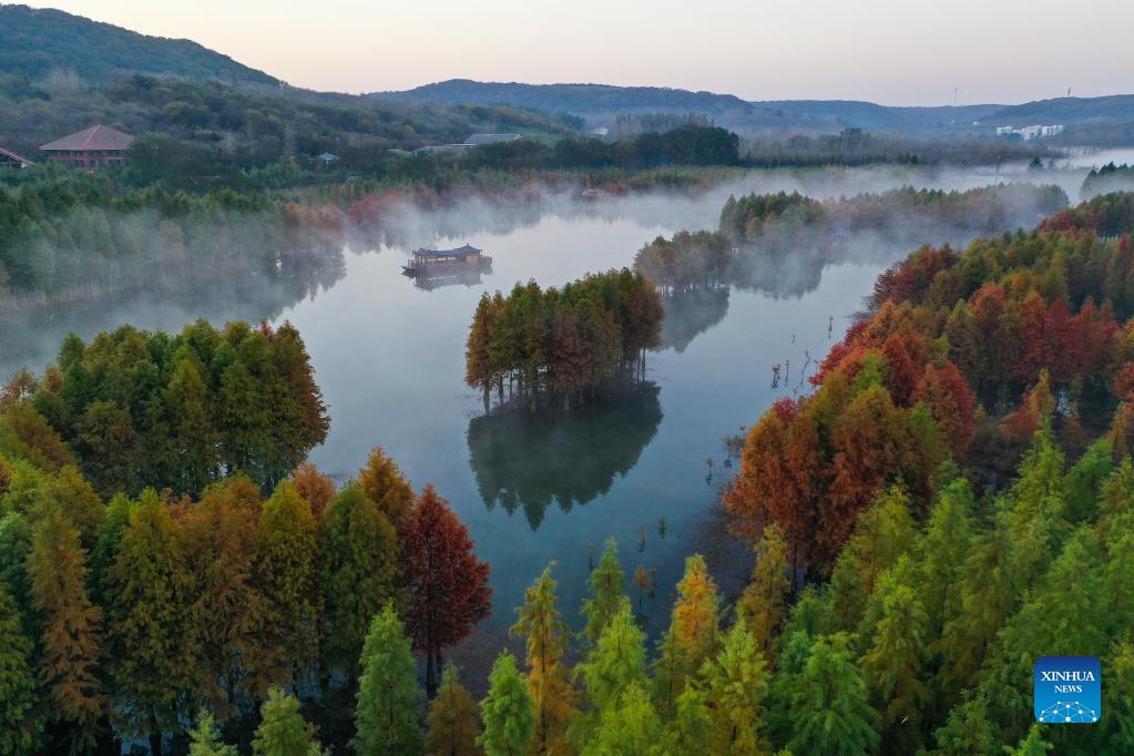Aerial photo taken on Nov. 14, 2021 shows a winter landscape of Tianquan Lake in Xuyi County, east China's Jiangsu Province. (Xinhua/Ji Chunpeng)