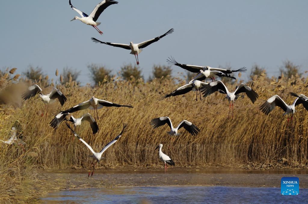 A flock of oriental white storks fly during their southward migration at Caofeidian wetland in Tangshan, north China's Hebei Province, Nov. 14, 2021. The Caofeidian wetland, located in the city of Tangshan, is an important spot for the migratory bird species which is under first-class national protection and is listed as "endangered" by the International Union for Conservation of Nature. (Xinhua/Yang Shiyao)