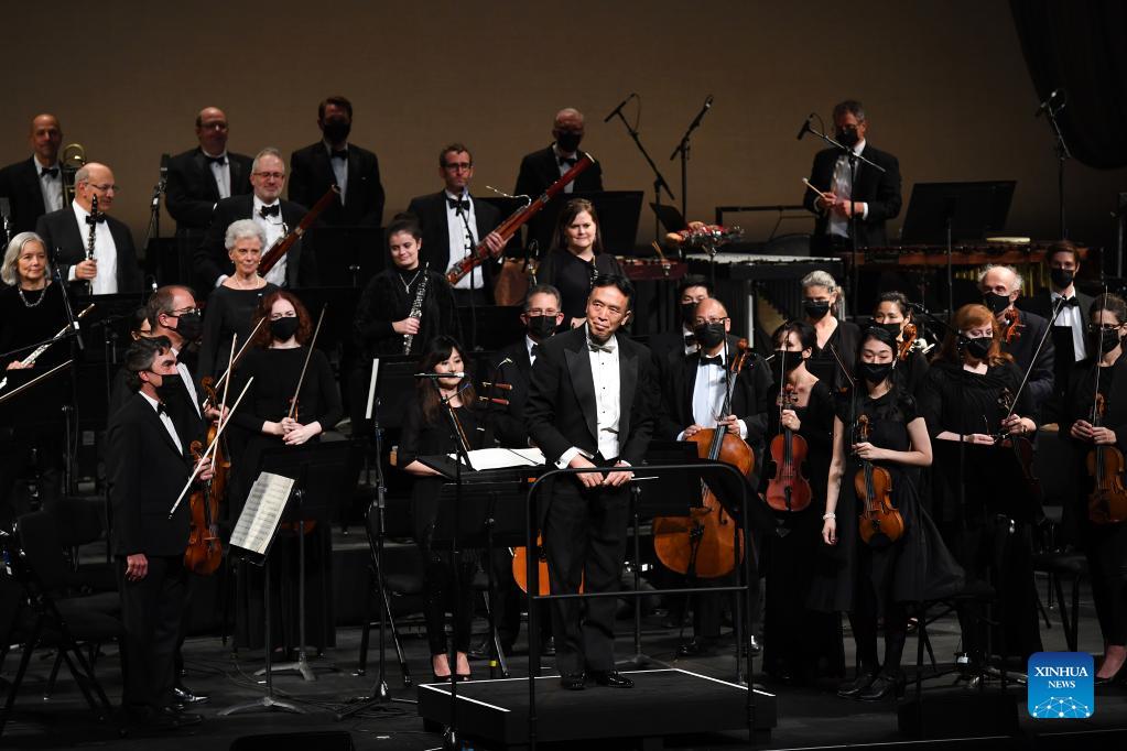Conductor Cai Jindong (C) and the New York City Ballet Orchestra react during the concert "East/West: A Symphonic Celebration" at Lincoln Center in New York, the United States, Nov. 13, 2021. A concert held in New York City's Lincoln Center on Saturday night charmed the audience with multiple Chinese musical pieces. The concert is part of "Image China," a cultural exchange initiative presented by China Arts and Entertainment Group, which aims to introduce traditional and contemporary Chinese performing arts to audiences around the world. (Xinhua/Li Rui)