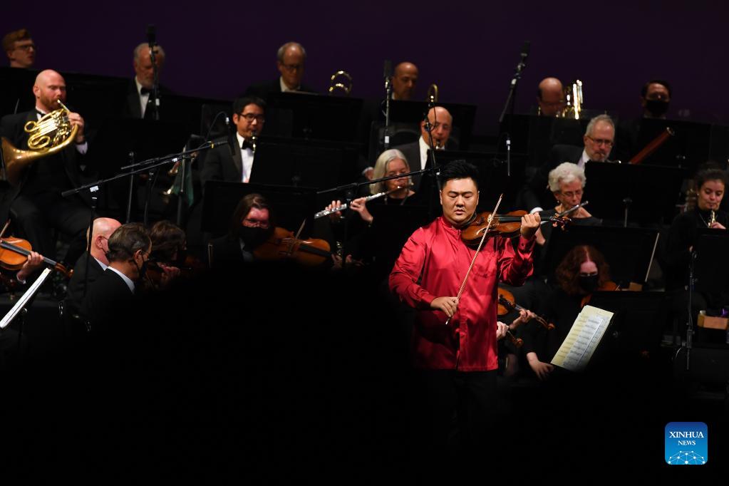 Violinist Hu Shenghua (front) and the New York City Ballet Orchestra perform during the concert "East/West: A Symphonic Celebration" at Lincoln Center in New York, the United States, Nov. 13, 2021. A concert held in New York City's Lincoln Center on Saturday night charmed the audience with multiple Chinese musical pieces. The concert is part of "Image China," a cultural exchange initiative presented by China Arts and Entertainment Group, which aims to introduce traditional and contemporary Chinese performing arts to audiences around the world. (Xinhua/Li Rui)