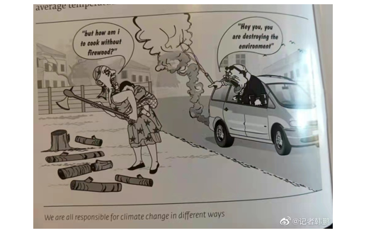 Photo shows a cartoon used by Chinese Ambassador to the US Qin Gang at a meeting on climate change. (Photo from Weibo)
