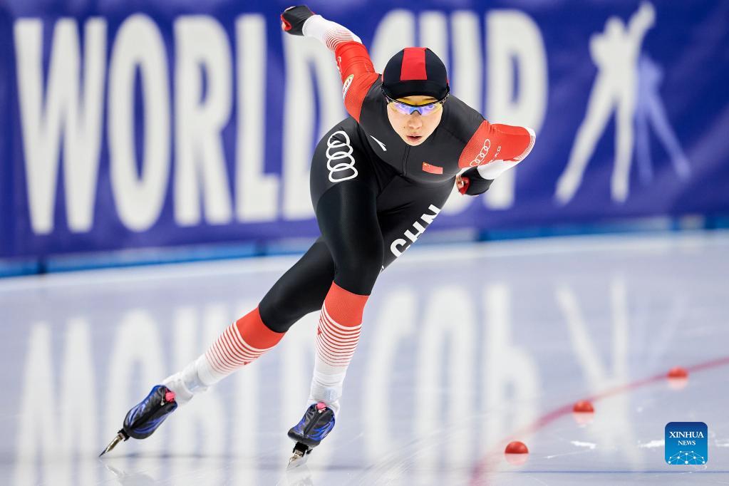 Li Qishi of China competes during the women's 1500m division A race at the ISU Speed Skating World Cup in Tomaszow Mazowiecki, Poland, Nov. 14, 2021. (Photo by Rafal Oleksiewicz/Xinhua)