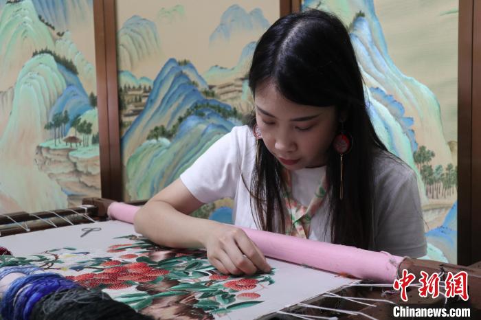 Liang Xiaoman works on a piece of embroidery work featuring litchi fruits. (Chinanews.com/Sun Qiuxia)