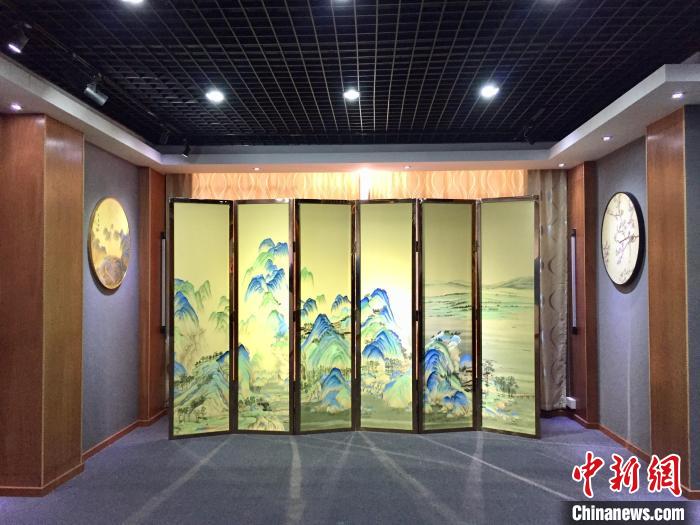 Photo shows a folding screen with landscape patterns embroidered on it by Liang Xiaoman. (Photo courtesy of Liang Xiaoman)