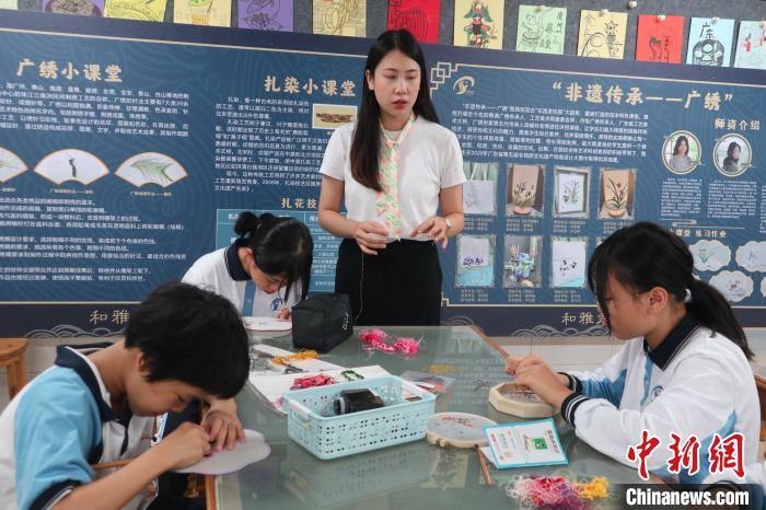 Liang Xiaoman teaches embroidery techniques to students at a school in Guangzhou. (Chinanes.com/Sun Qiuxia)