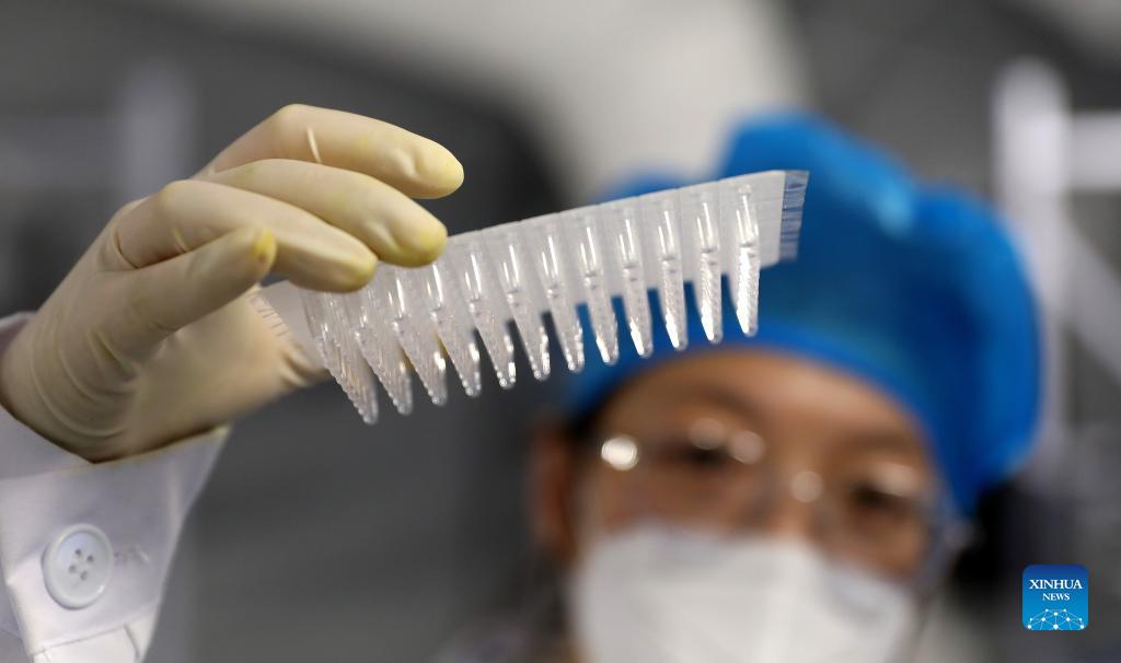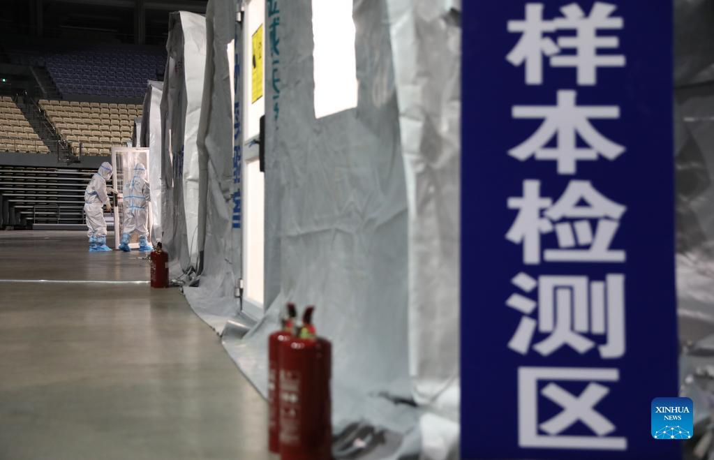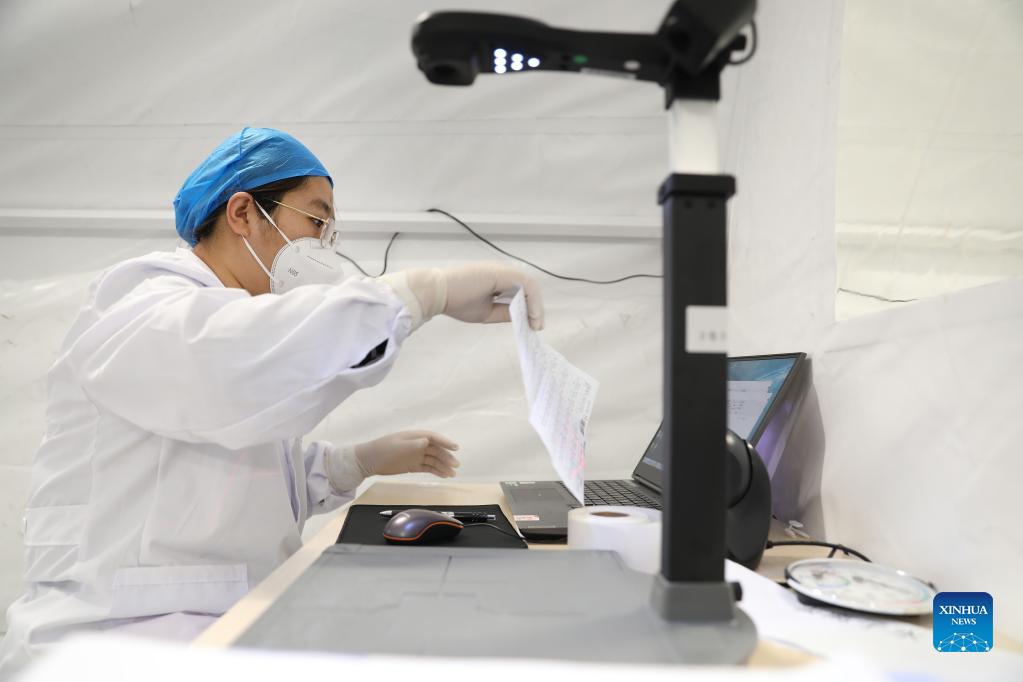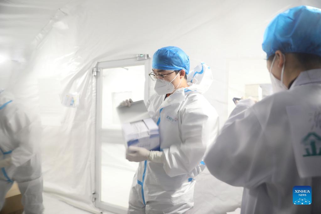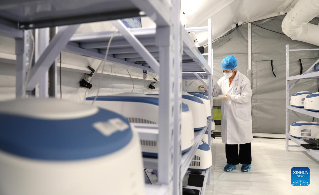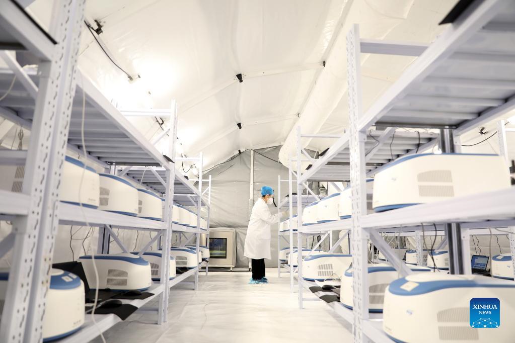 Medical worker Zhou Wenjing works at a "Falcon" air-inflated testing lab for COVID-19 nucleic acid testing in Dalian, northeast China's Liaoning Province, Nov. 15, 2021. A set of "Falcon" air-inflated testing lab has been put into use since Nov. 11 in Dalian for massive nucleic acid tests. The lab is capable of screening up to 80,000 samples every day. (Xinhua/Yao Jianfeng)