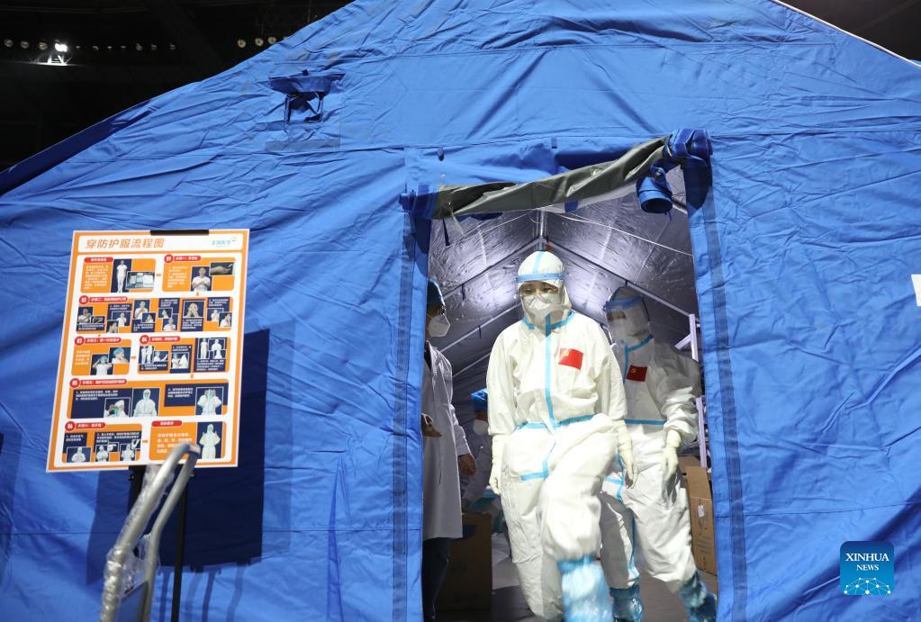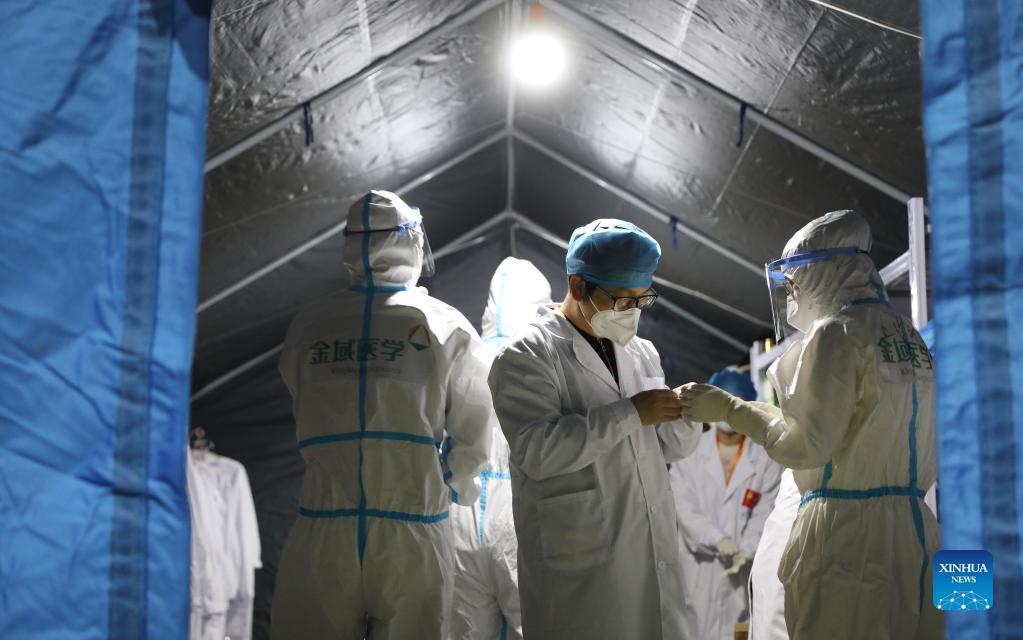 Medical workers put on protective suits to enter a "Falcon" air-inflated testing lab for COVID-19 nucleic acid testing in Dalian, northeast China's Liaoning Province, Nov. 15, 2021. A set of "Falcon" air-inflated testing lab has been put into use since Nov. 11 in Dalian for massive nucleic acid tests. The lab is capable of screening up to 80,000 samples every day. (Xinhua/Yao Jianfeng)