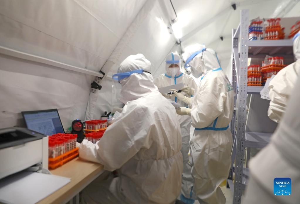Medical workers work at a "Falcon" air-inflated testing lab for COVID-19 nucleic acid testing in Dalian, northeast China's Liaoning Province, Nov. 15, 2021. A set of "Falcon" air-inflated testing lab has been put into use since Nov. 11 in Dalian for massive nucleic acid tests. The lab is capable of screening up to 80,000 samples every day. (Xinhua/Yao Jianfeng)