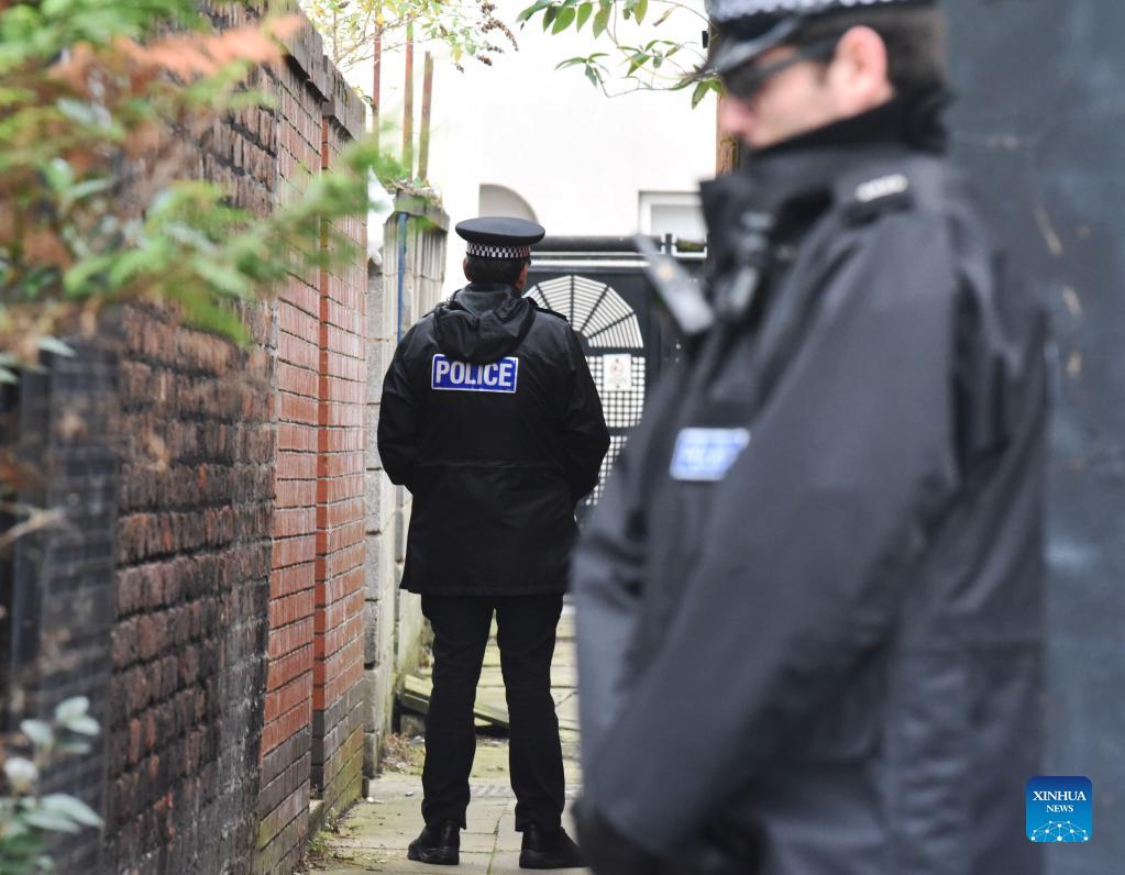 Police officers are seen on Sutcliffe Street after Sunday's explosion outside Liverpool Women's Hospital in Liverpool, Britain, on Nov. 15, 2021. British police on Monday said the explosion outside Liverpool Women's Hospital in Liverpool is being treated as a terrorist incident. (Photo by Chris Neill/Xinhua)