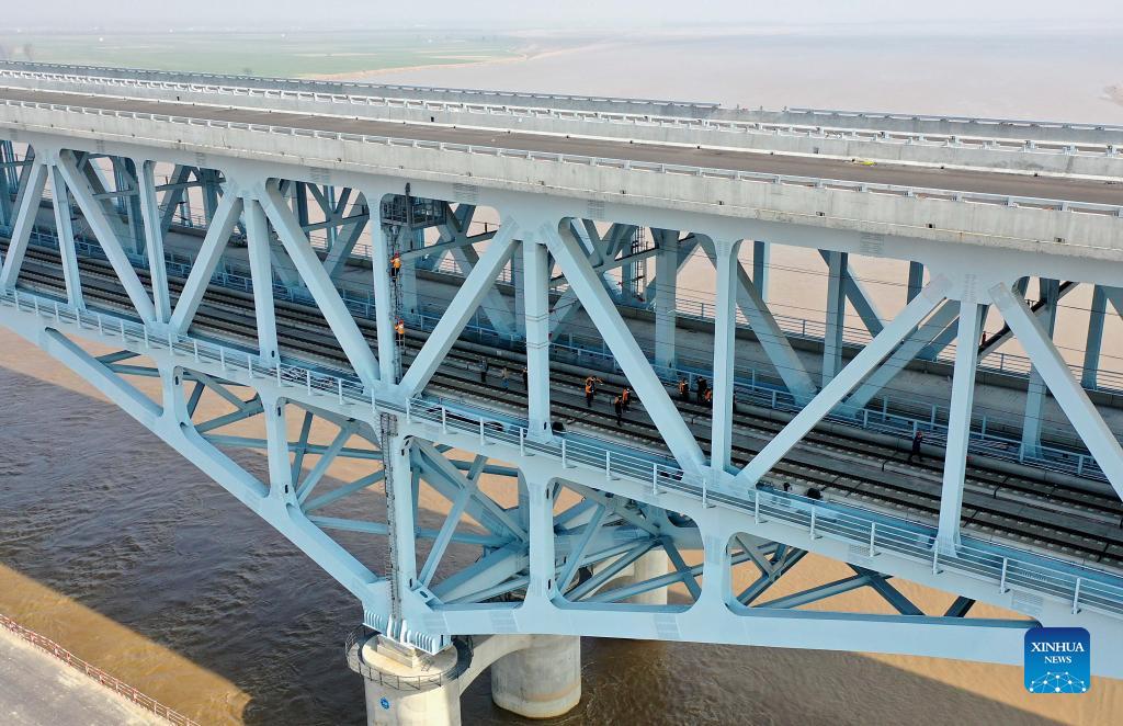 In this aerial photo, staff members inspect a section of Zhengzhou-Jinan high-speed railway, in central China's Henan Province, Nov. 15, 2021. The Zhengzhou-Puyang section in Henan Province of Zhengzhou-Jinan high-speed railway are undergoing the final check and acceptance inspection. (Xinhua/Li An)