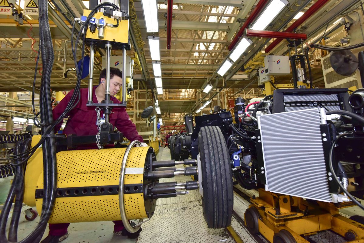An employee works on the assembly line of a carmaker in Qingzhou, Shandong province. [Photo by Wang Jilin/For China Daily]