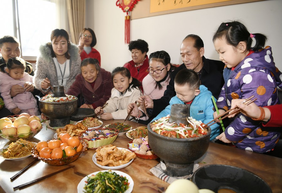 Xie Xingchang (2nd R) and his family enjoy a family reunion dinner in Minning Town of Yinchuan, northwest China's Ningxia Hui Autonomous Region, Jan. 24, 2020. (Xinhua/Wang Peng)