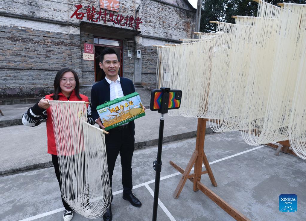 Li Rong (R) and Guo Hongmei sell handmade noodles via live streaming in Huyuan Township of Fuyang District, Hangzhou City, east China's Zhejiang Province, Nov. 16, 2021. Noodle culture festival, noodle making activity, intangible cultural heritage performance and other events have been held in Huyuan Township in recent years, as efforts to promote the development of agricultural and rural tourism industries. (Xinhua/Xu Yu)