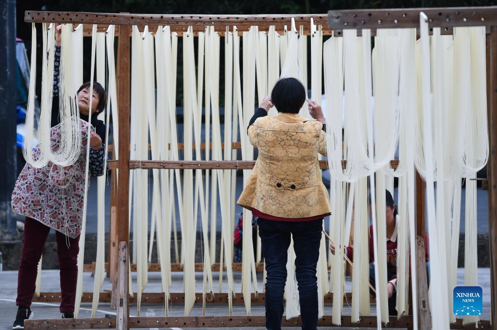 Villagers dry handmade noodles in Huyuan Township of Fuyang District, Hangzhou City, east China's Zhejiang Province, Nov. 16, 2021. Noodle culture festival, noodle making activity, intangible cultural heritage performance and other events have been held in Huyuan Township in recent years, as efforts to promote the development of agricultural and rural tourism industries. (Xinhua/Xu Yu)
