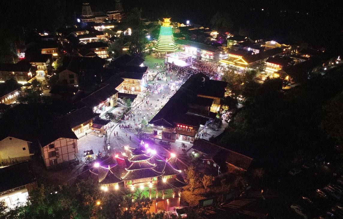 Zhaishadong village at the foot of Mount Fanjing in southwest China’s Guizhou province is ablaze with lights and crowded with tourists, July 10, 2021. (People’s Daily Online/Li He)