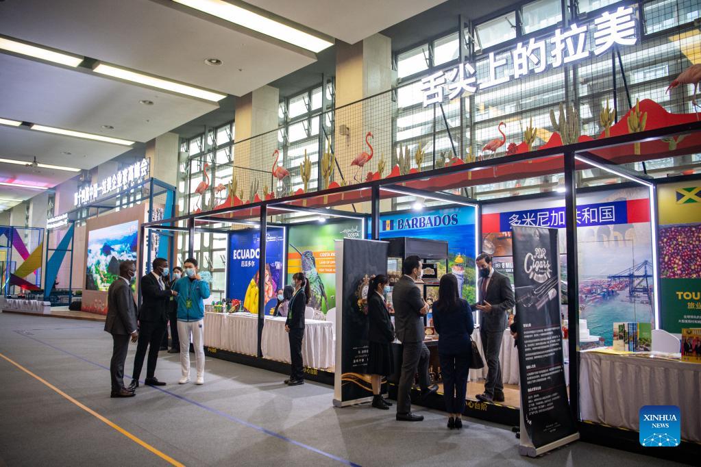 Participants communicate with each other at an exhibition of the 14th China-LAC Business Summit in southwest China's Chongqing, Nov. 16, 2021. The summit kicked off Tuesday here in Chongqing. (Xinhua/Tang Yi)