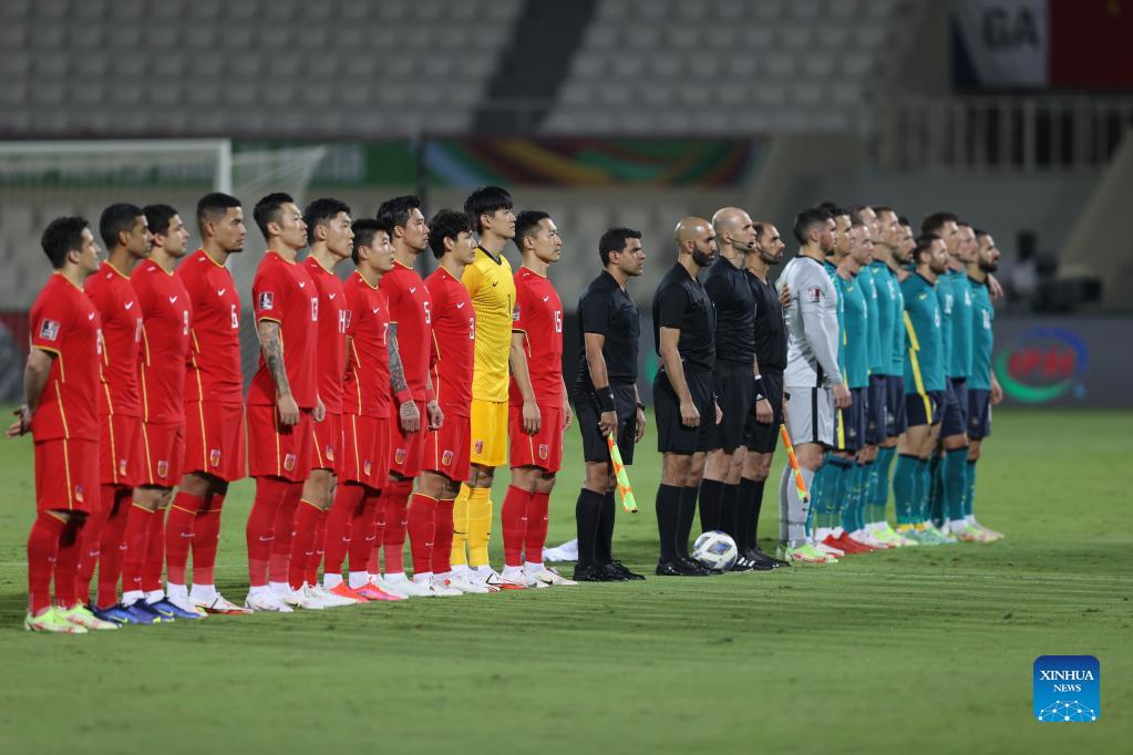 Starting players of both sides line up with referees prior to a Group B match between China and Australia of 2022 FIFA World Cup Asian qualifiers in Sharjah, the United Arab Emirates, on Nov. 16, 2021. (Xinhua)