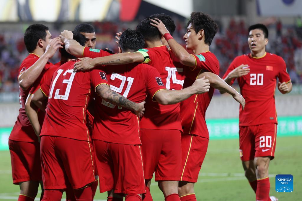 Players of China celebrates during a Group B match between China and Australia of 2022 FIFA World Cup Asian qualifiers in Sharjah, the United Arab Emirates, on Nov. 16, 2021. (Xinhua)