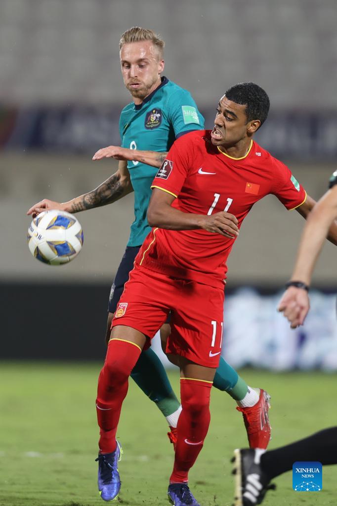 A Lan (R) of China vies with James Jeggo of Australia during a Group B match between China and Australia of 2022 FIFA World Cup Asian qualifiers in Sharjah, the United Arab Emirates, on Nov. 16, 2021. (Xinhua)