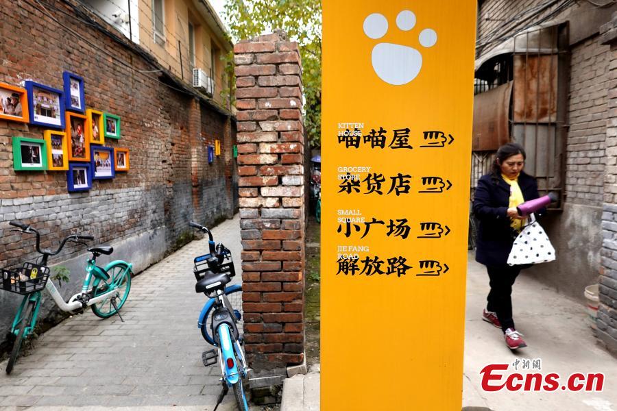Photo taken on Nov. 16, 2021 shows a "Meow" lane with images of cartoon cats in downtown Xi'an, Northwest China's Shaanxi Province. (Photo: China News Service/Zhang Yuan)