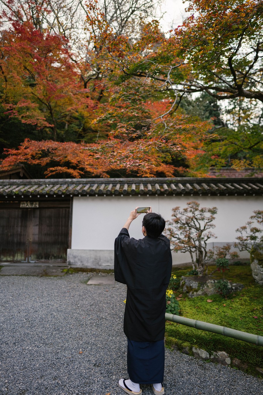 A visitor takes photos of red leaves at Nanzenji Temple in Kyoto, Japan, Nov. 15, 2021. (Xinhua/Zhang Xiaoyu)