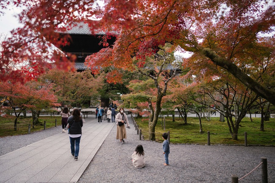 People view the scenery of red leaves at Nanzenji Temple in Kyoto, Japan, Nov. 15, 2021. (Xinhua/Zhang Xiaoyu)