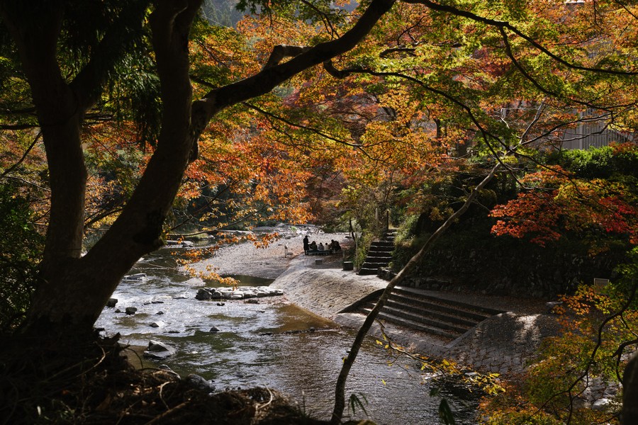 People relax under trees by a river in Kyoto, Japan, Nov. 16, 2021. (Xinhua/Zhang Xiaoyu)