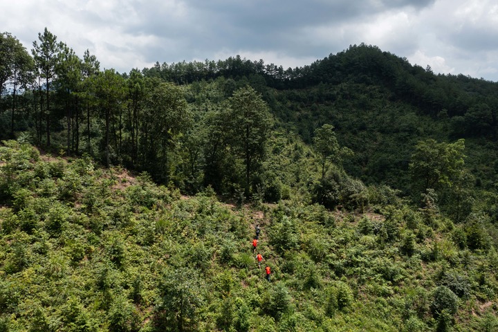 Volunteers patrol a forest area in east China's Zhejiang Province, July 20, 2021. The forest area covering some 22 hectares was launched in 2017 aiming to help reduce carbon dioxide emissions and achieve carbon neutrality. (Xinhua/Xu Yu)