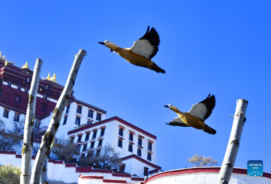 Birds are seen at Longwangtan park in Lhasa, southwest China's Tibet Autonomous Region, Nov. 17, 2021. (Xinhua/Zhang Rufeng)
