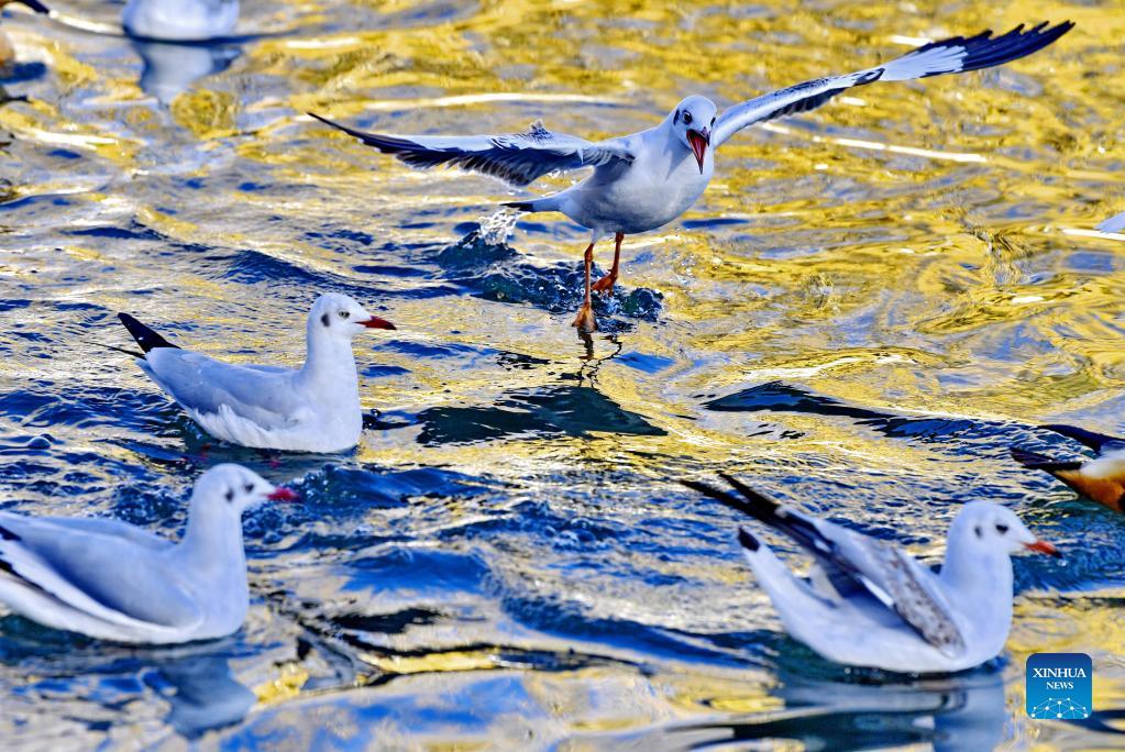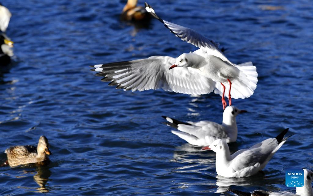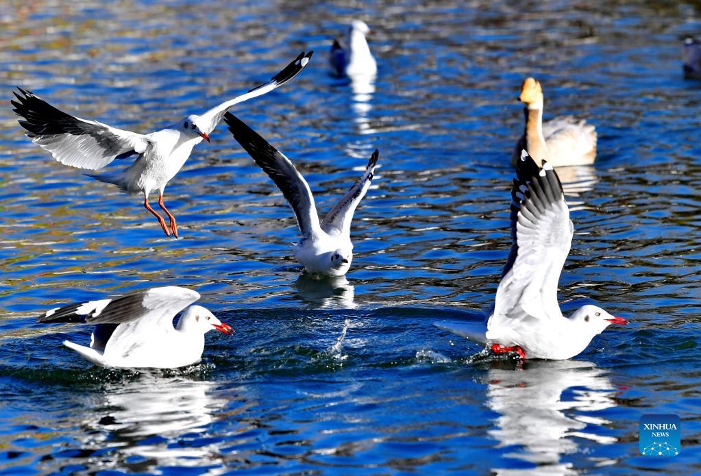 Black-headed gulls are seen at Longwangtan park in Lhasa, southwest China's Tibet Autonomous Region, Nov. 17, 2021. (Xinhua/Zhang Rufeng)