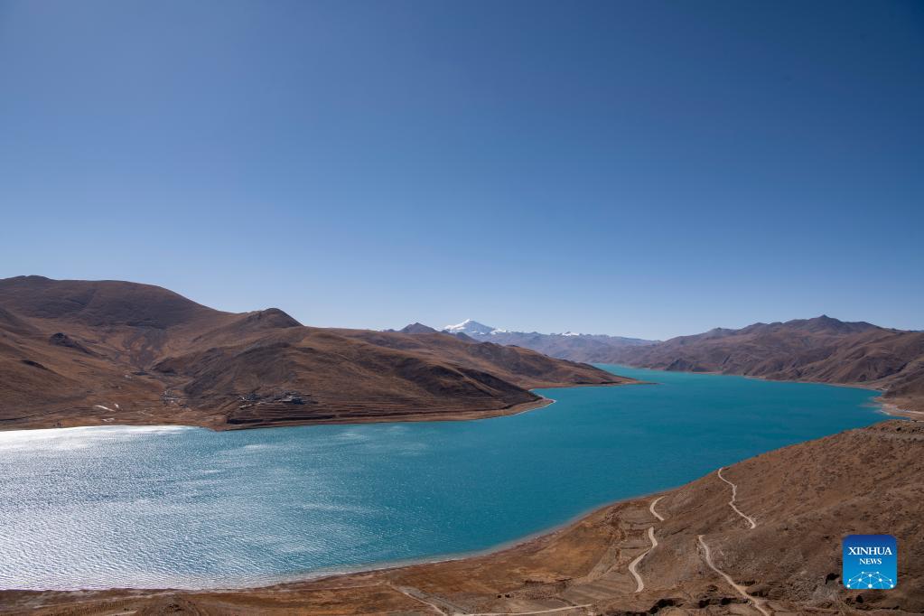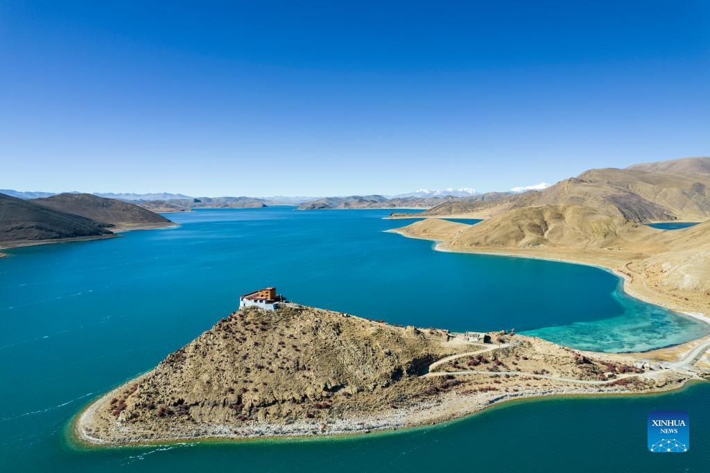 Photo taken on Nov. 16, 2021 shows the scenery of Yamzbog Yumco Lake in Shannan, southwest China's Tibet Autonomous Region. (Xinhua/Sun Fei)