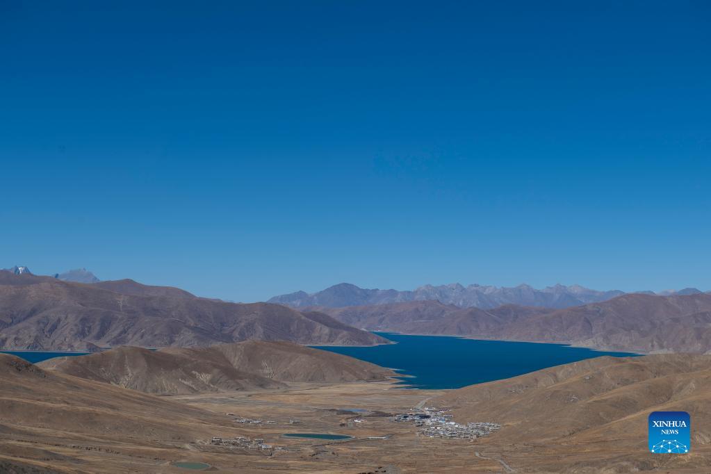 Photo taken on Nov. 16, 2021 shows the Yamzbog Yumco Lake and the nearby villages in Shannan, southwest China's Tibet Autonomous Region. (Xinhua/Sun Ruibo)