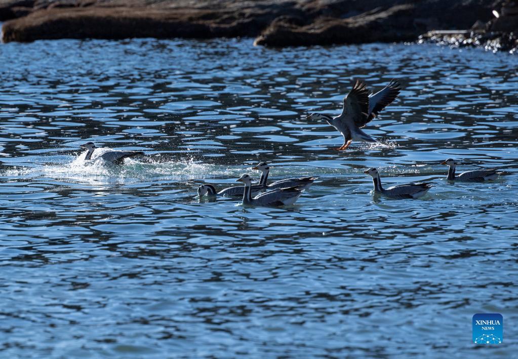 Photo taken on Nov. 16, 2021 shows birds swimming on the Yamzbog Yumco Lake in Shannan, southwest China's Tibet Autonomous Region. (Xinhua/Sun Fei)
