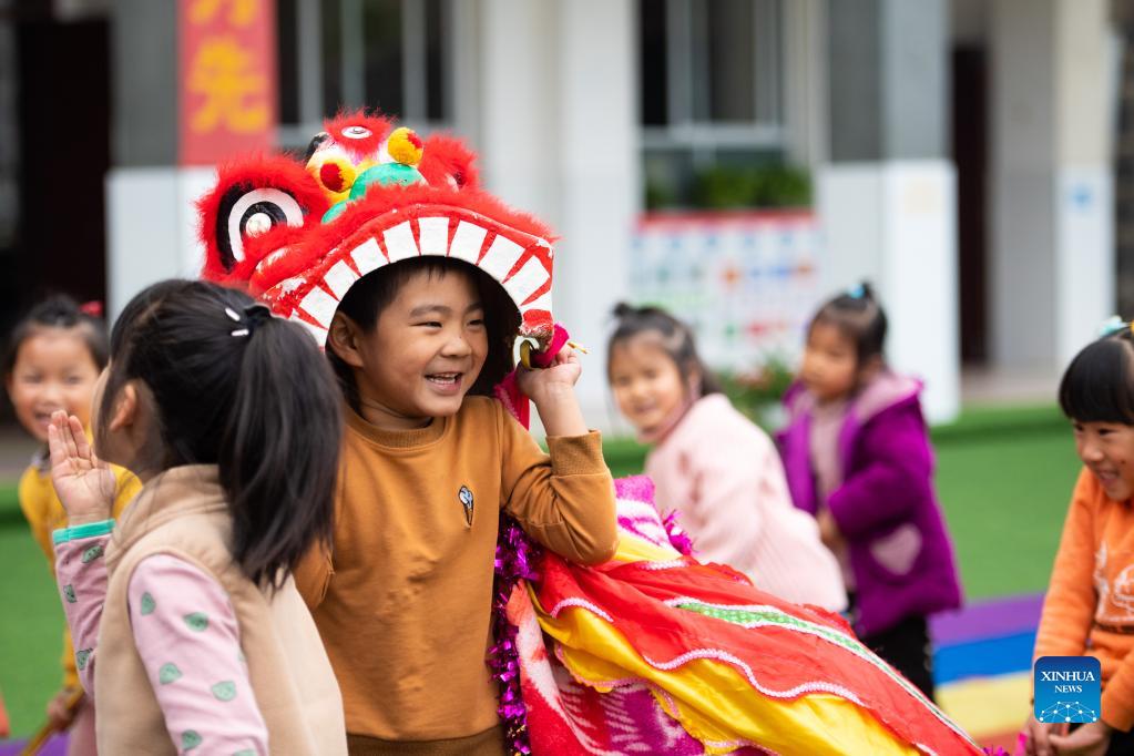Children practice dragon dance at a kindergarten in Yaotianping Town in Dingcheng District of Changde, central China's Hunan Province, Nov. 17, 2021. The kindergarten invited folk artists to give a dragon dance and lion dance lesson to the children, providing small kids an opportunity to have a close watch on the local intangible cultural heritage. (Xinhua/Chen Sihan)